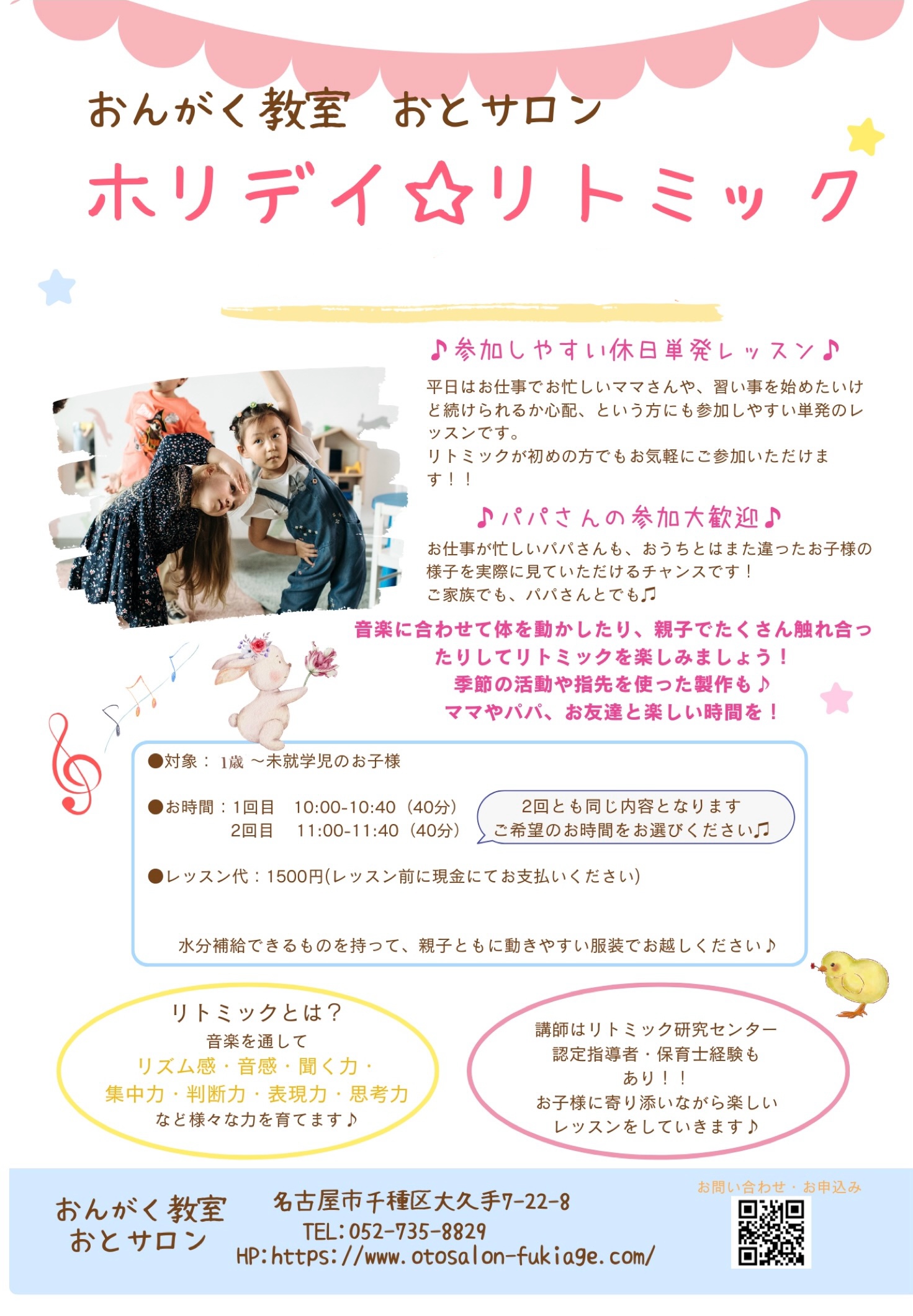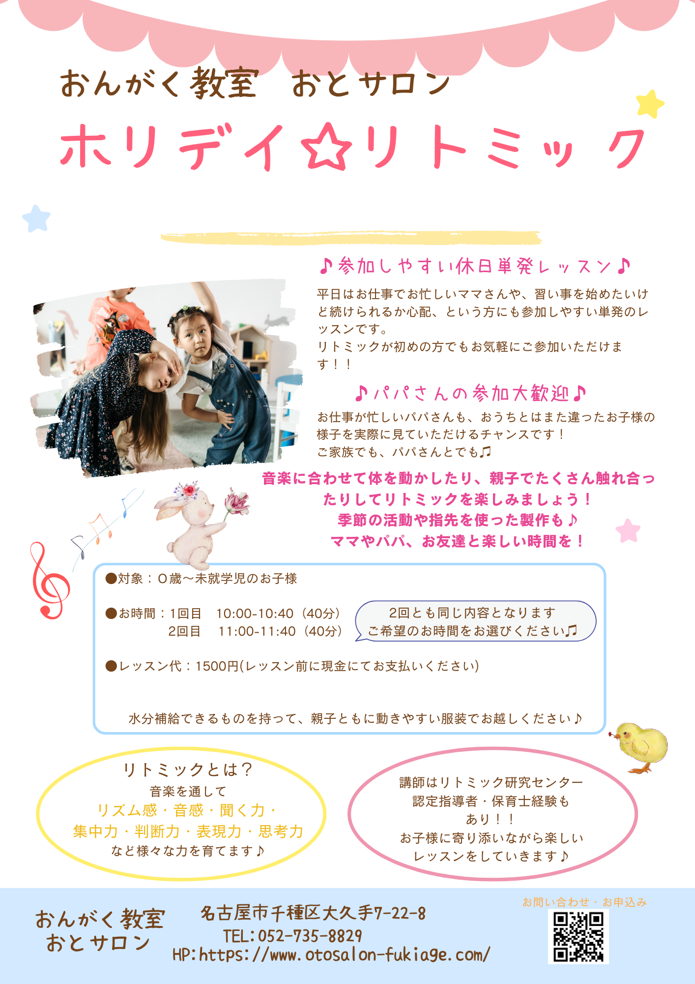 不定期(月1回程度)で土日祝に開催する単発のリトミックレッスンになります。